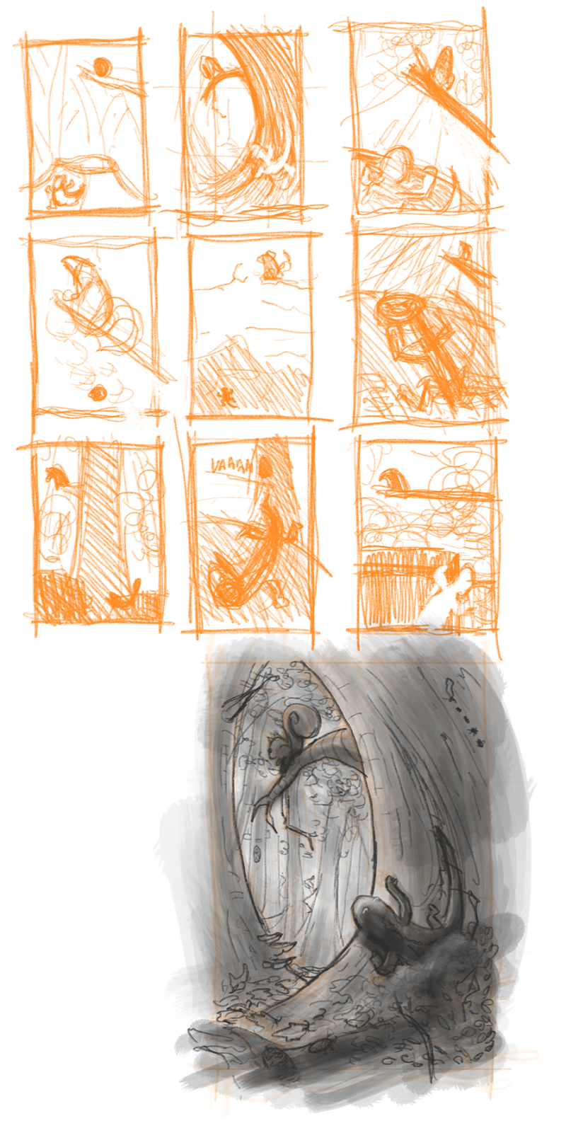 I did some super-rough(!) thumbnails and roughly sketched out one with values. Any advise, comment is greatly appreciated. I have to get used to putting myself out there